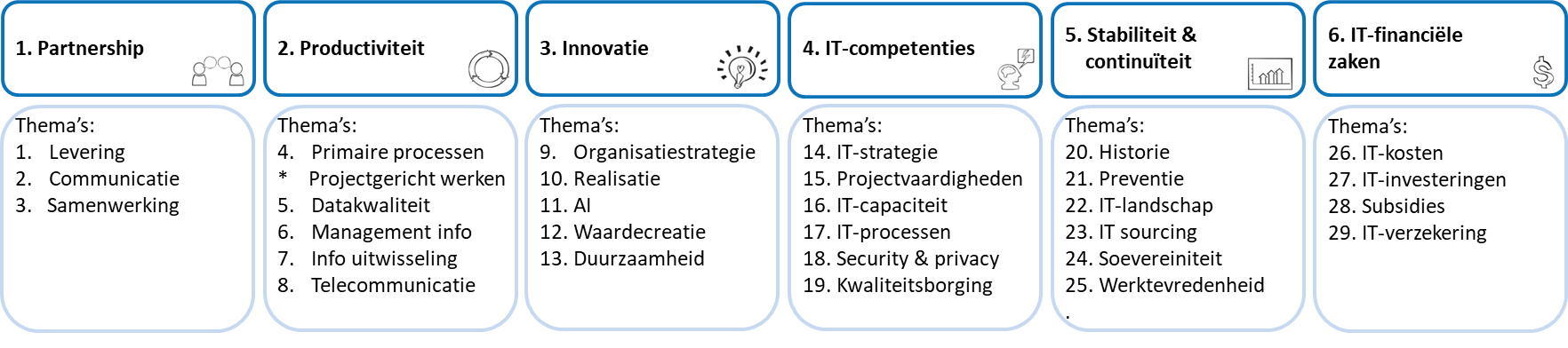 We inspireren organisaties en geven integraal inzicht om keuzes en snelheid te maken. De Zes succesfactoren voor digitale transformatie© kun je eenvoudig meten en verbeteren met de BusinessITScan®. Dit helpt je om collega's te verbinden en doelen te halen. Onze collega's en partners assisteren je daarbij graag!